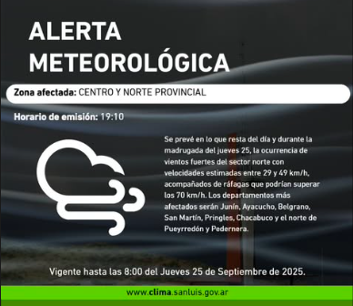 Además, se esperan cambios bruscos en el viento: desde la mañana soplará del sector norte, con velocidades de entre 40 y 60 km/h, y hacia la tarde rotará al sur, manteniendo la intensidad. La temperatura máxima rondará los 26 grados, pero hacia la noche se espera un marcado descenso, con mínimas cercanas a los 8 grados.